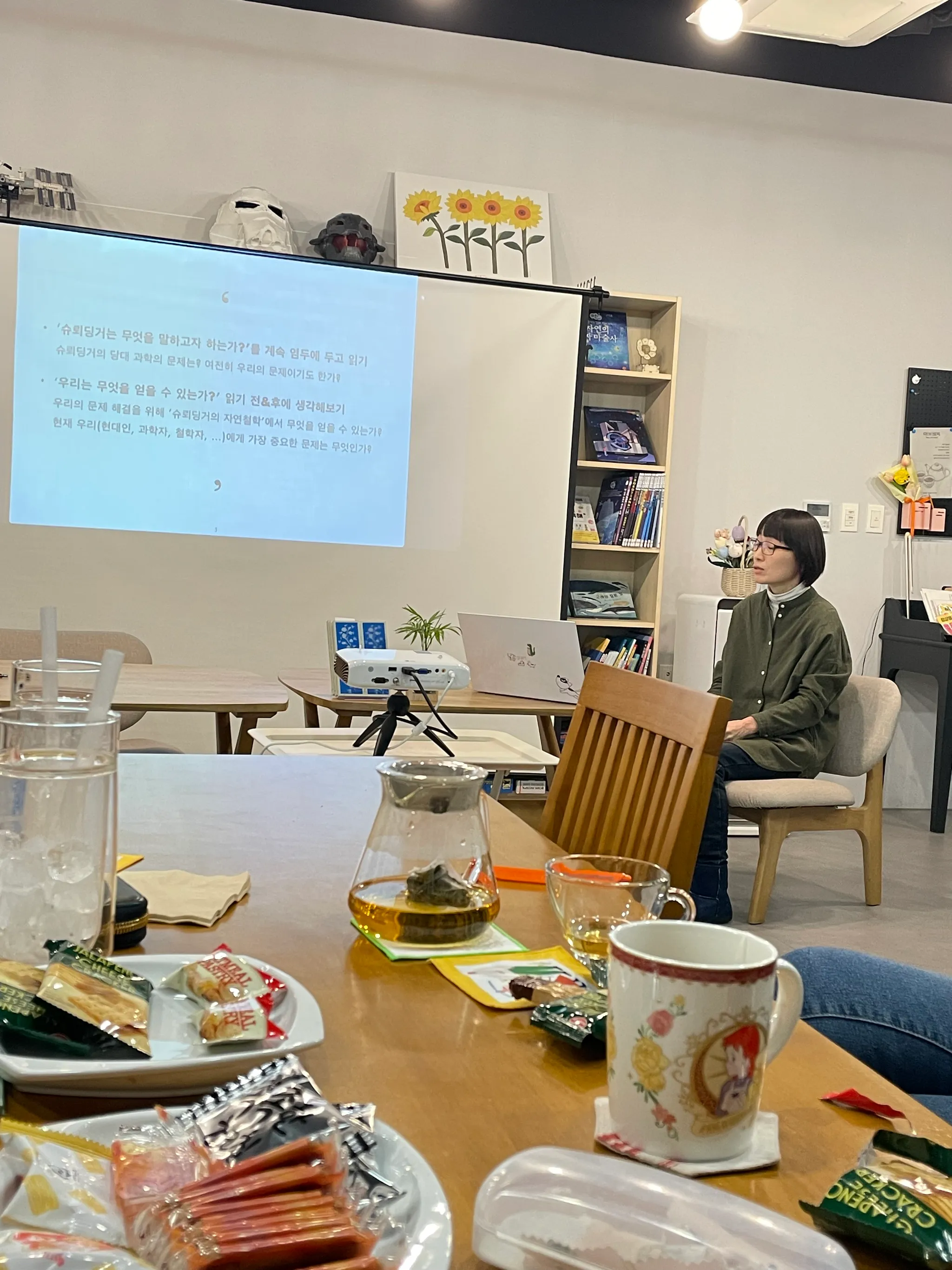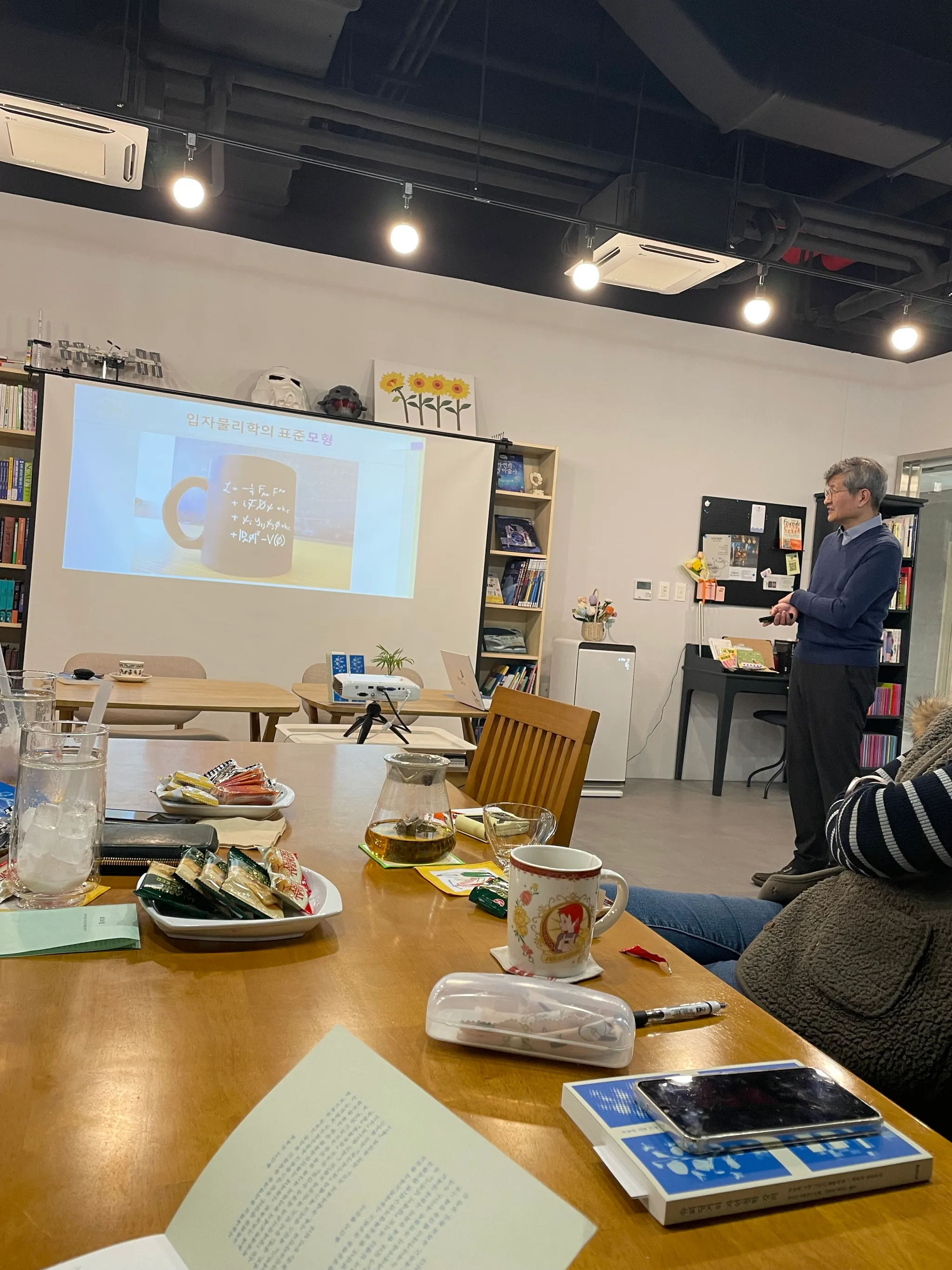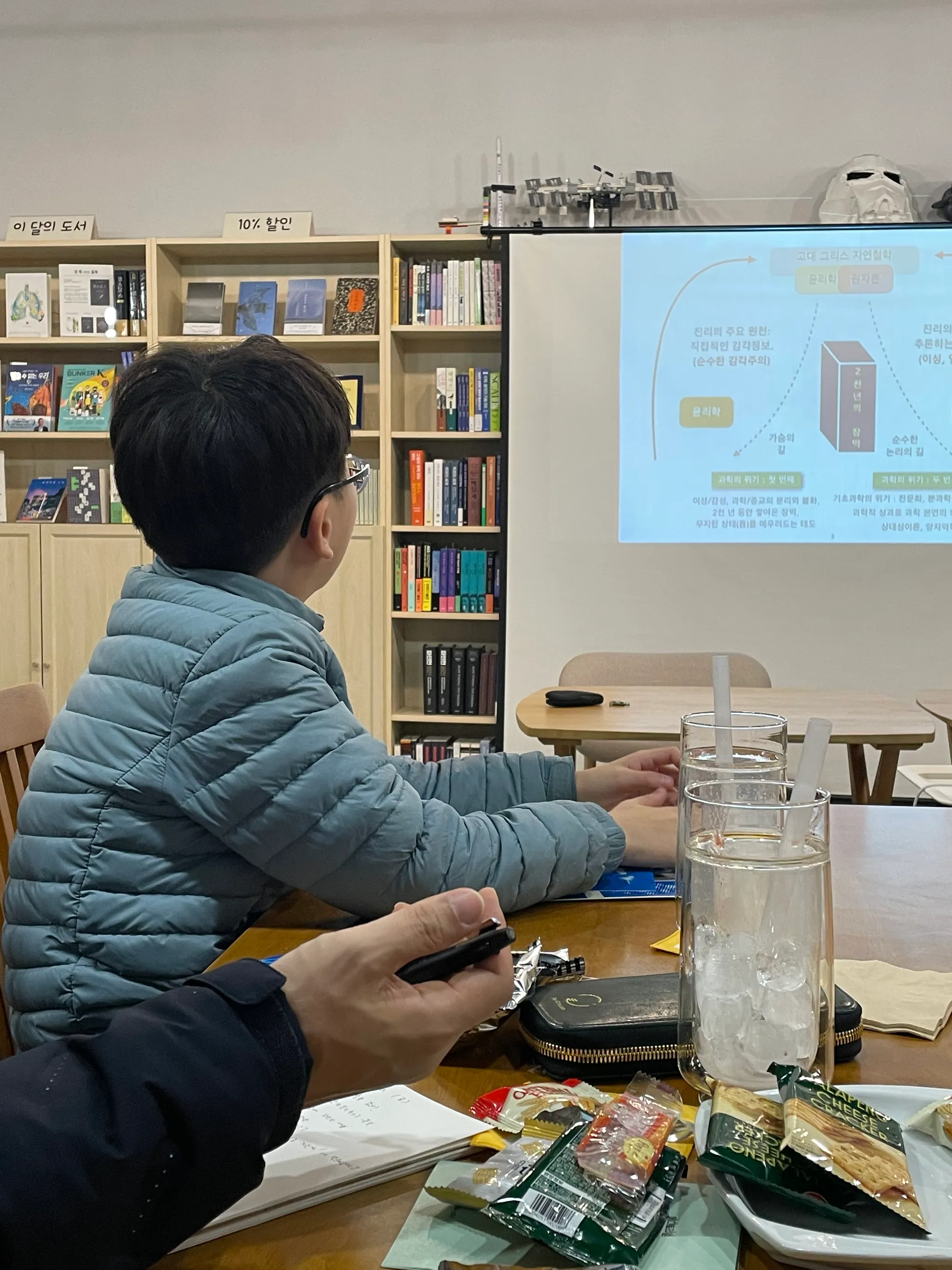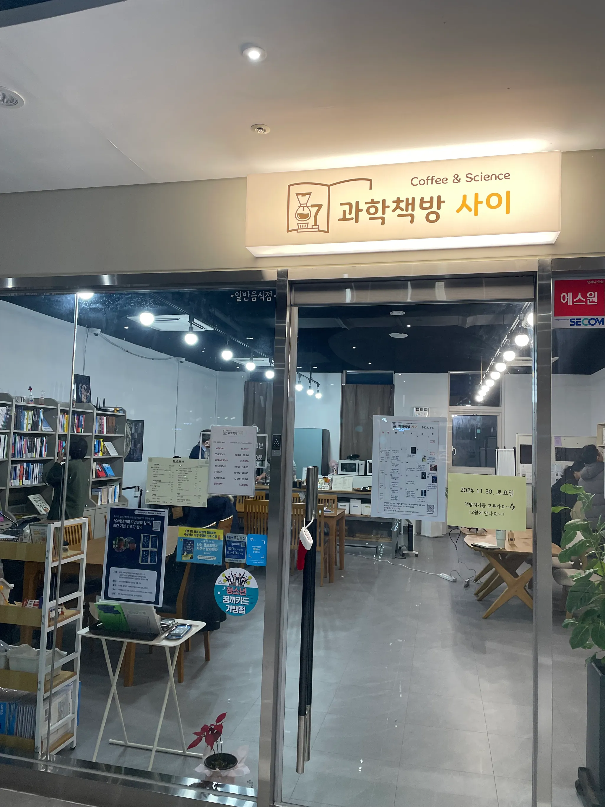 과학 분야 도서로 특화한 책방이라니. 각별한 느낌과 기대를 안고 내려갔다. 사이 오유미 대표님은 예상대로 이과 전공이었다. :)) 책방 소셜미디어에서 본 사이펀커피를 청하여 마셨다. 사이펀커피 내리는 모습은 동영상으로도 찍었다. 커피 이름이 사이언스+펀을 줄인 건 줄 알았는데, 커피를 추춣하는 방식에 붙여진 고유명이라고 한다. 과학과 과학책, SF를 모두 한 책방에서 만난 건 이번이 두 번째란 사실은 또 얼마나 반갑던지. 이날처럼 저녁이 아니라 낮에 와서 사이펀커피를 마시며 과학책을 읽고 싶은 동네책방. 초등학생이 아빠와 함께 북토크에 와주어서 감동 먹은 날. “얼마나 작으면 양자라고 하나요?“라는 질문을 주었지 뭔가요! :))